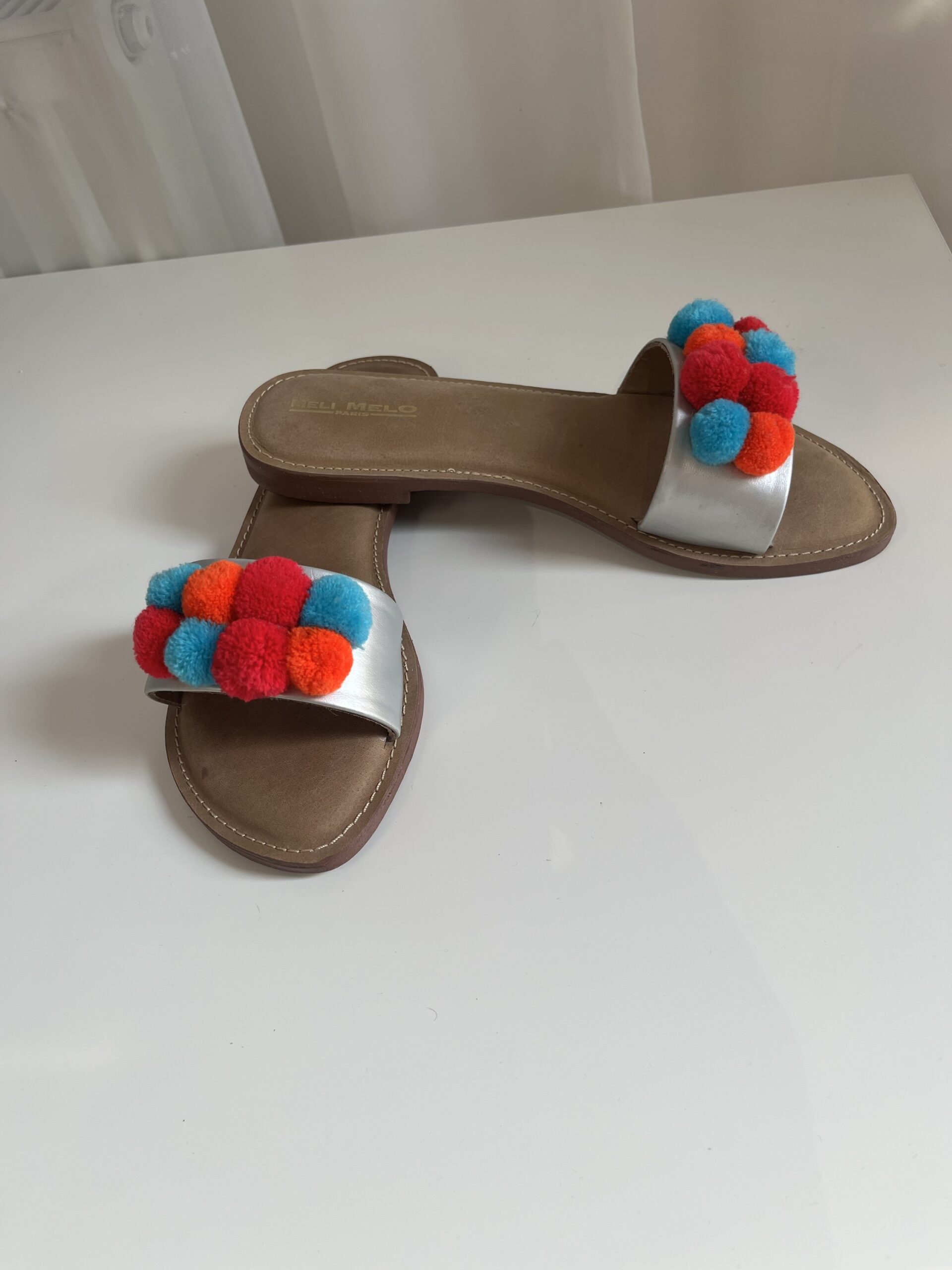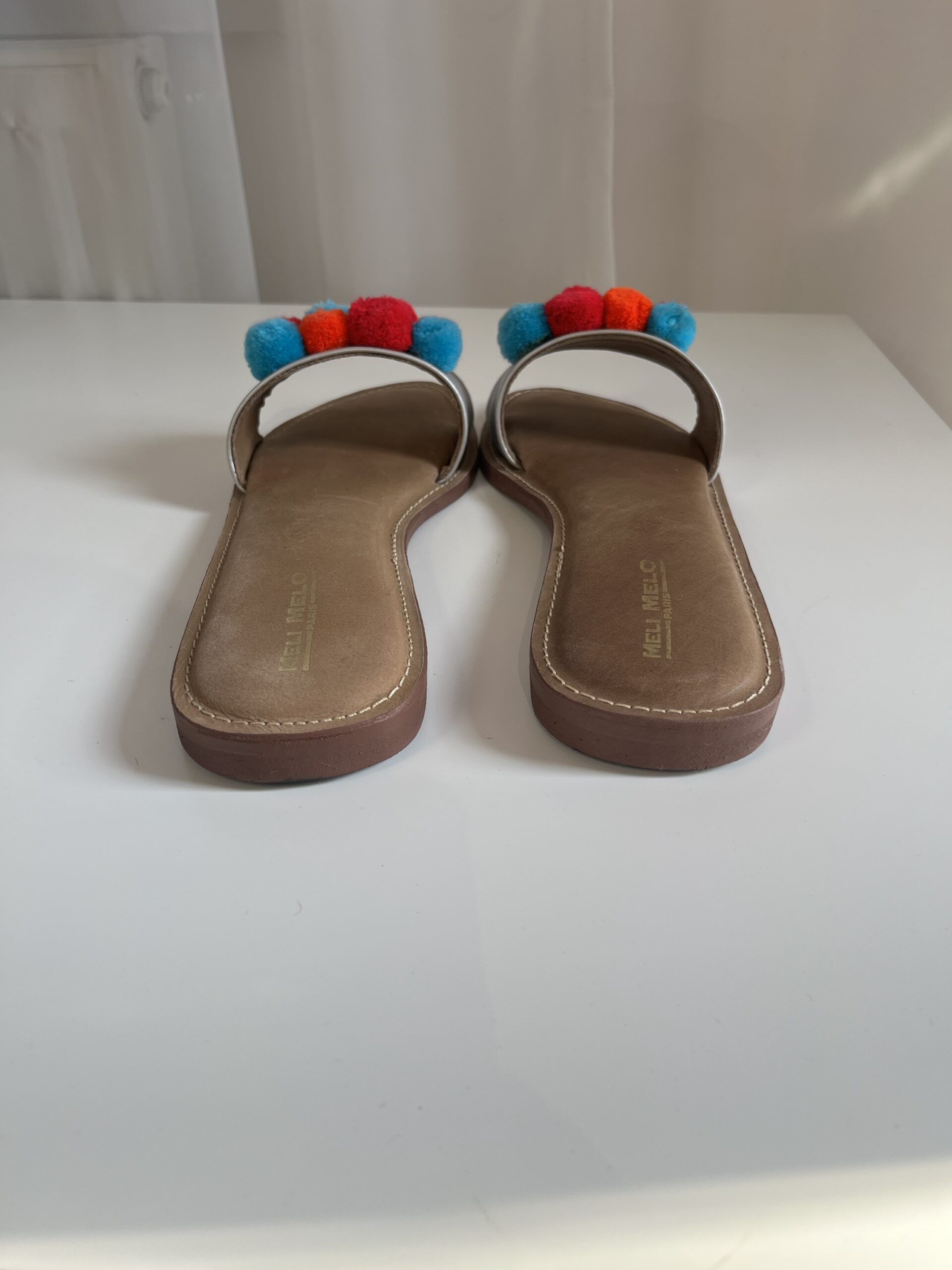 Slapi Meli Melo, veseli si stylish, culoare maro / argintiu cu pompoane colorate, marime 38, lungime 26, noi fara eticheta. Perfecti pentru vara si vacanta!
