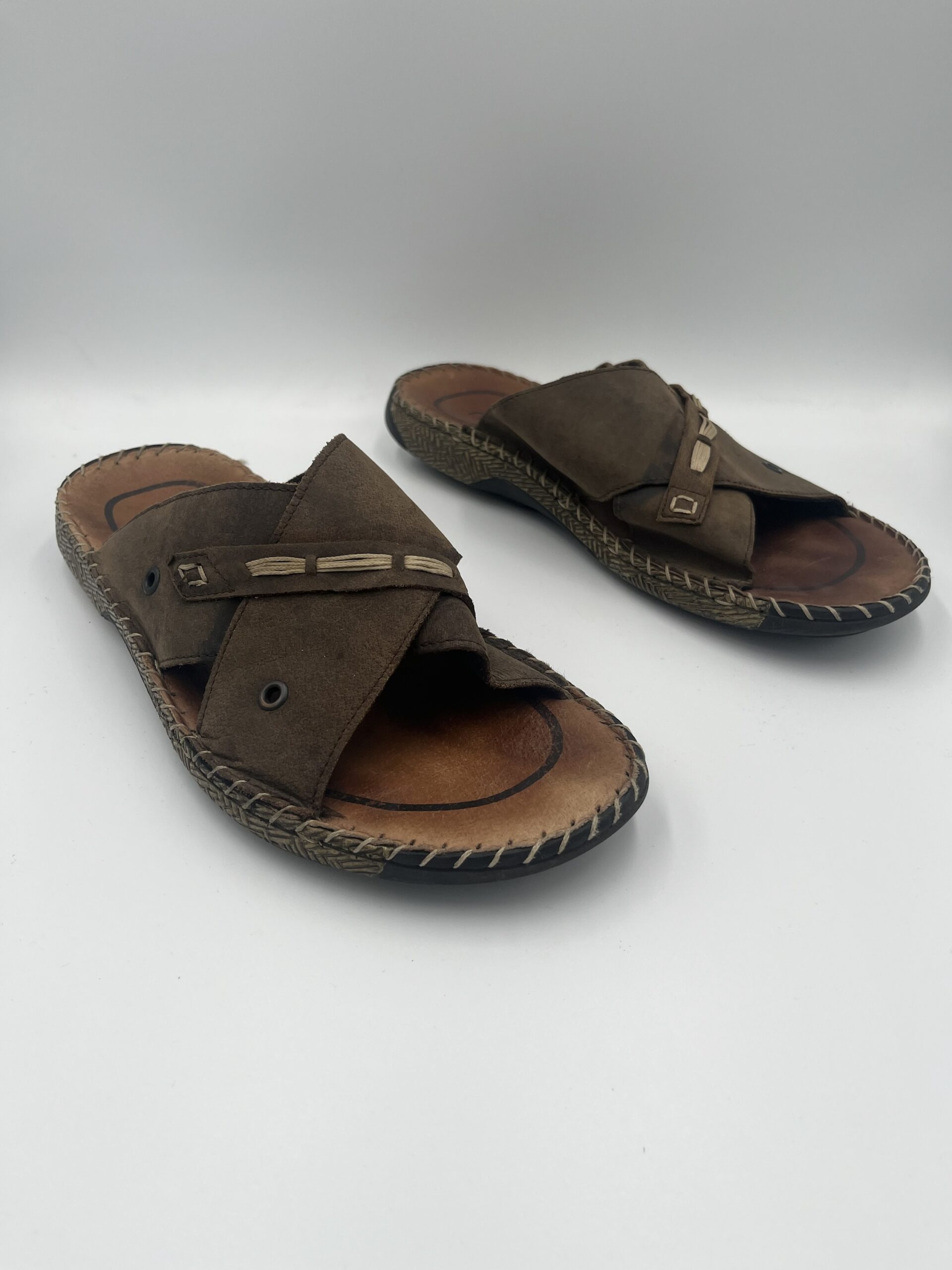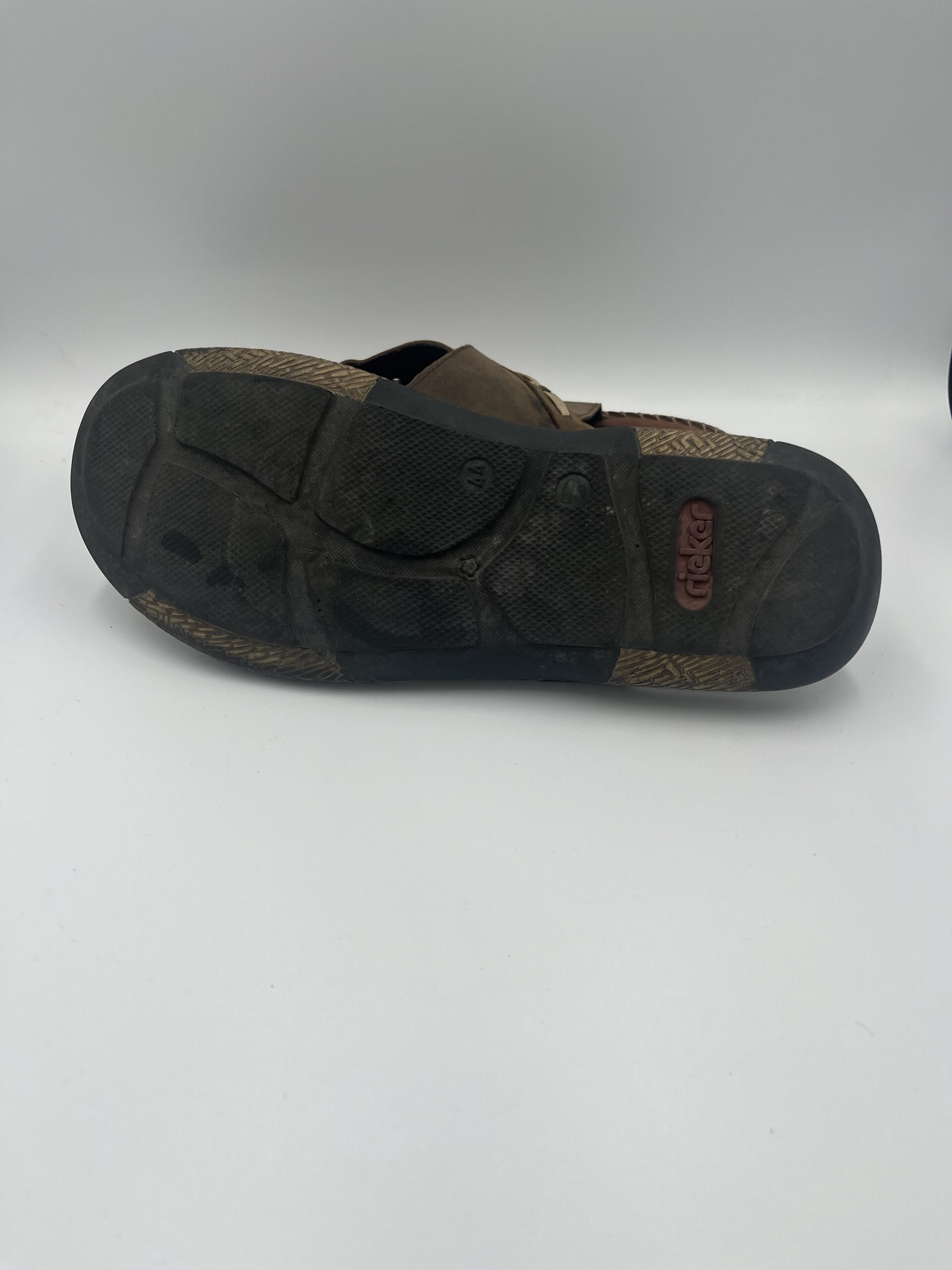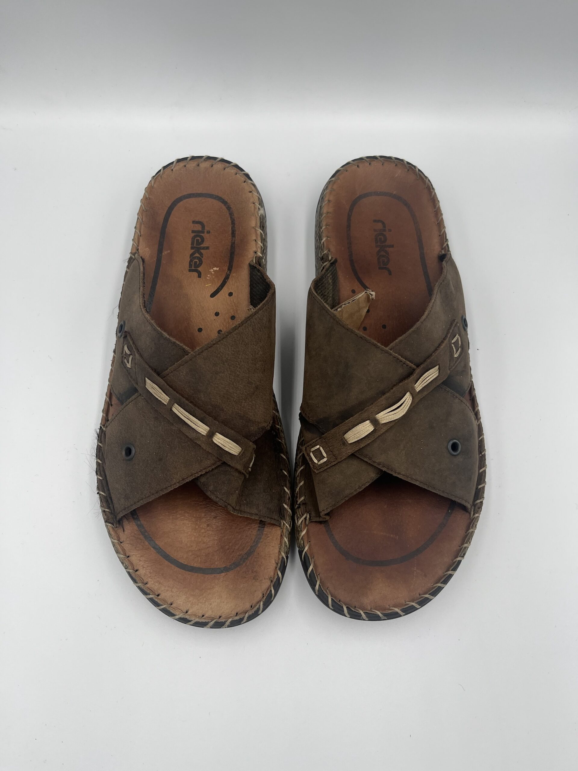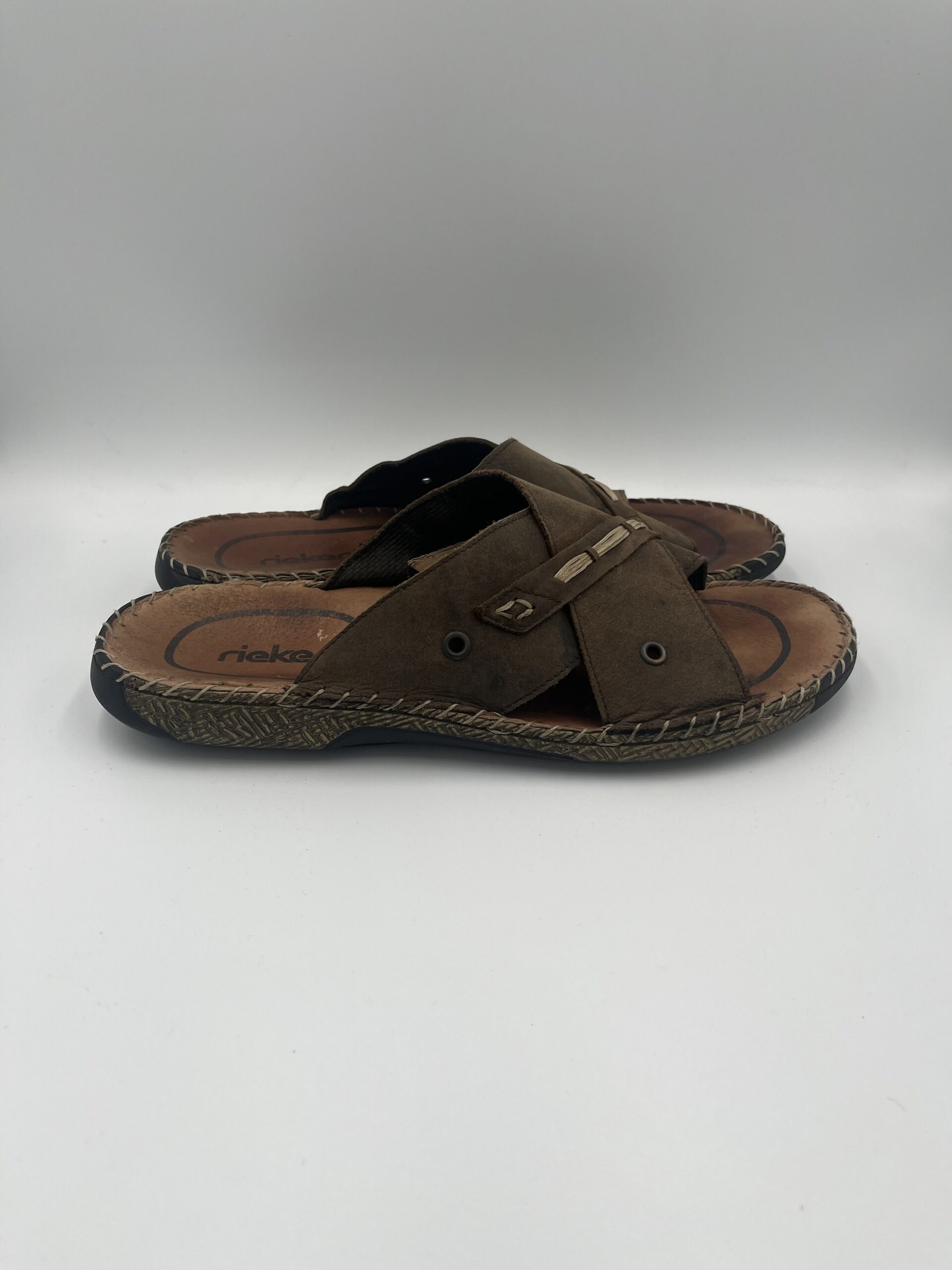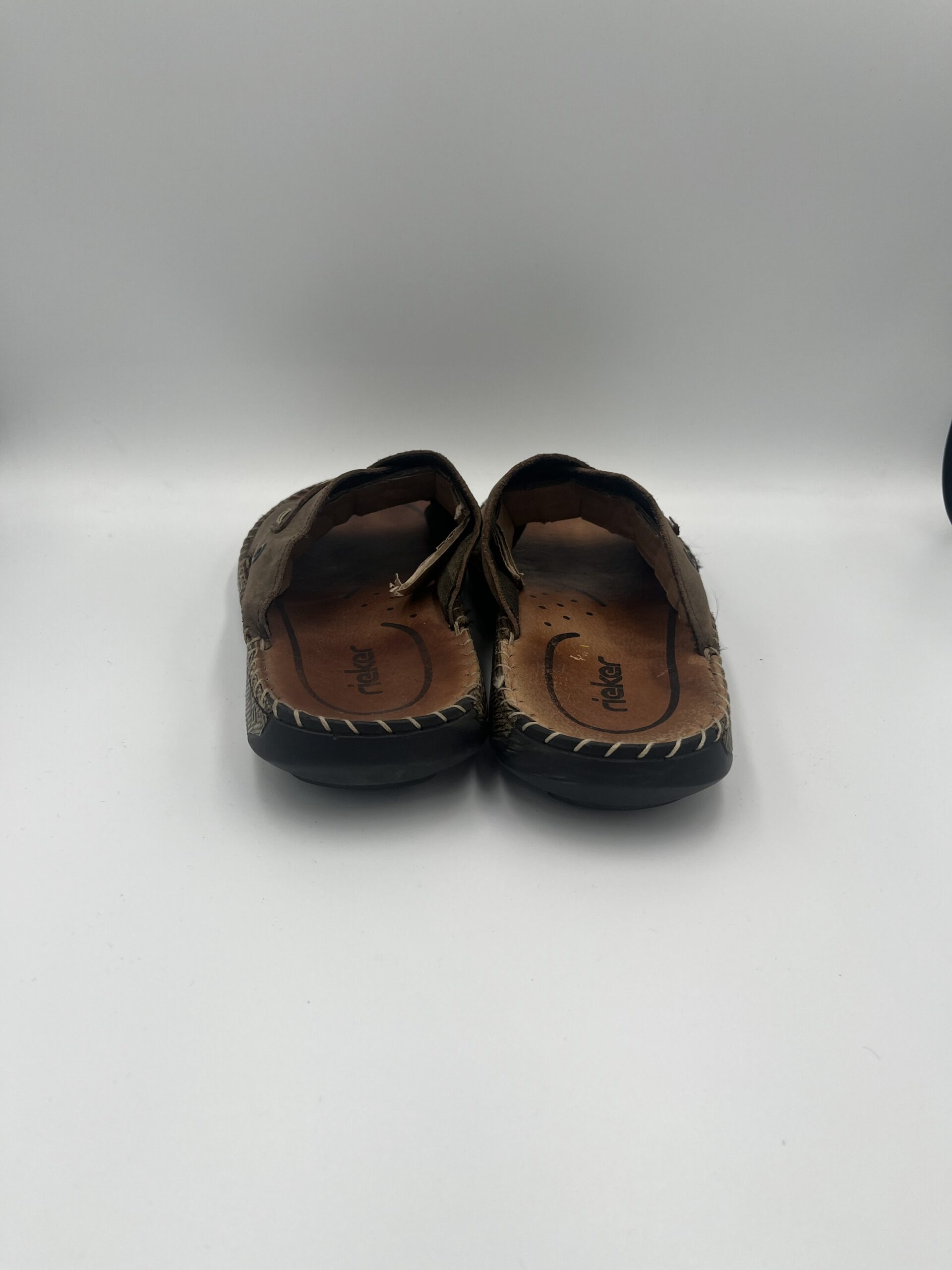 Slapi Rieker, din piele, culoare maro, marime 44, interior 27,5, purtati, stare foarte buna