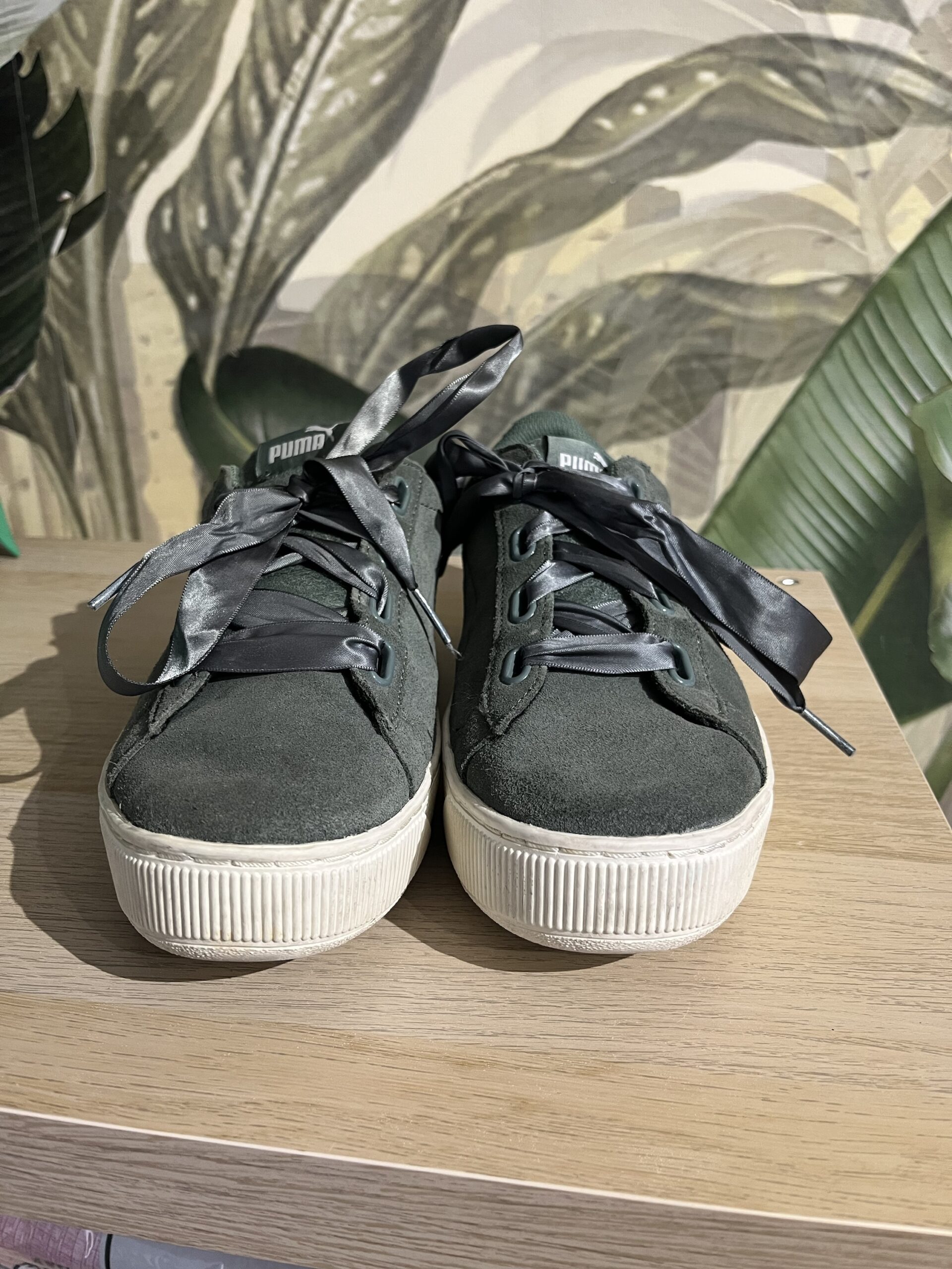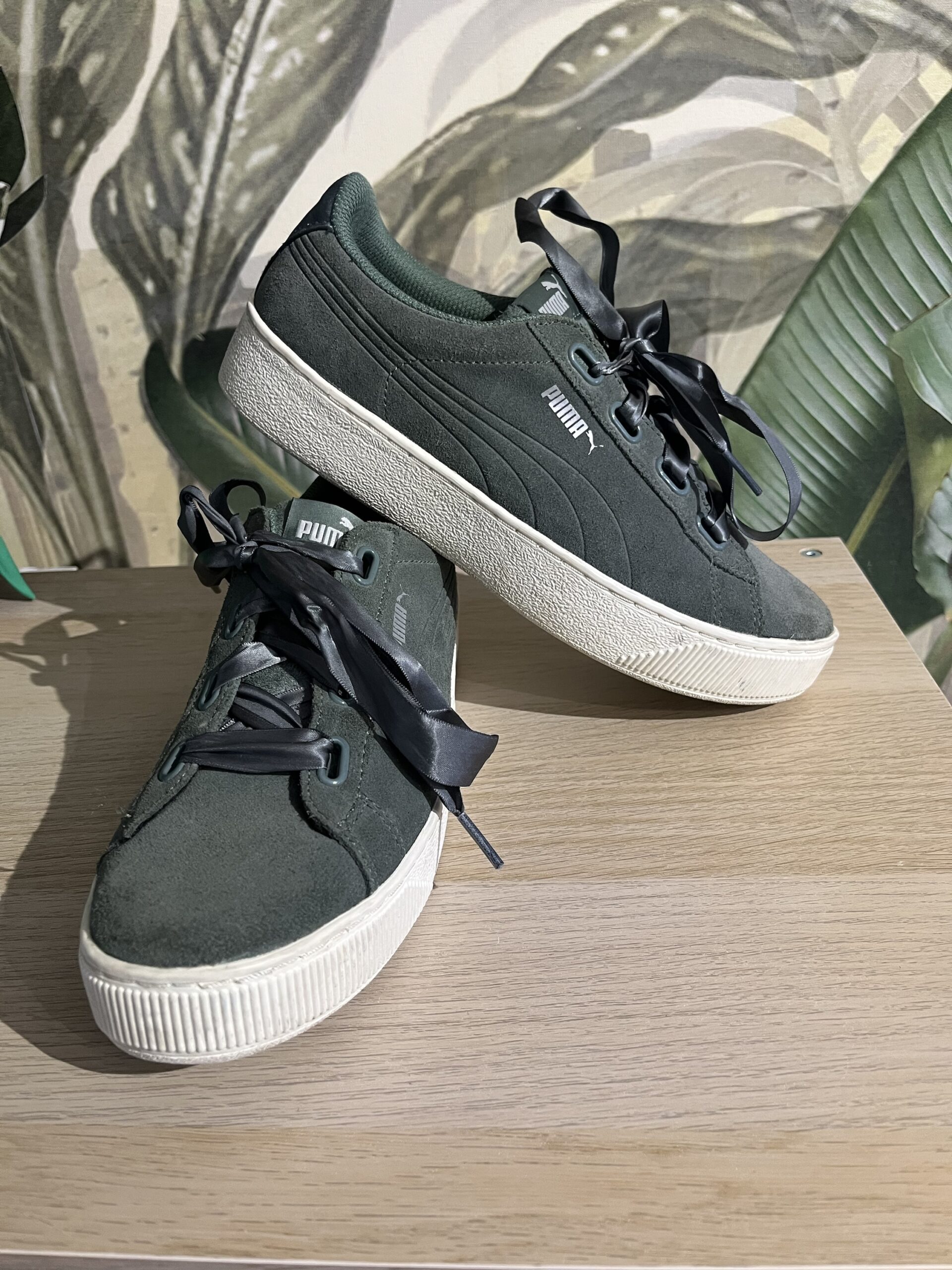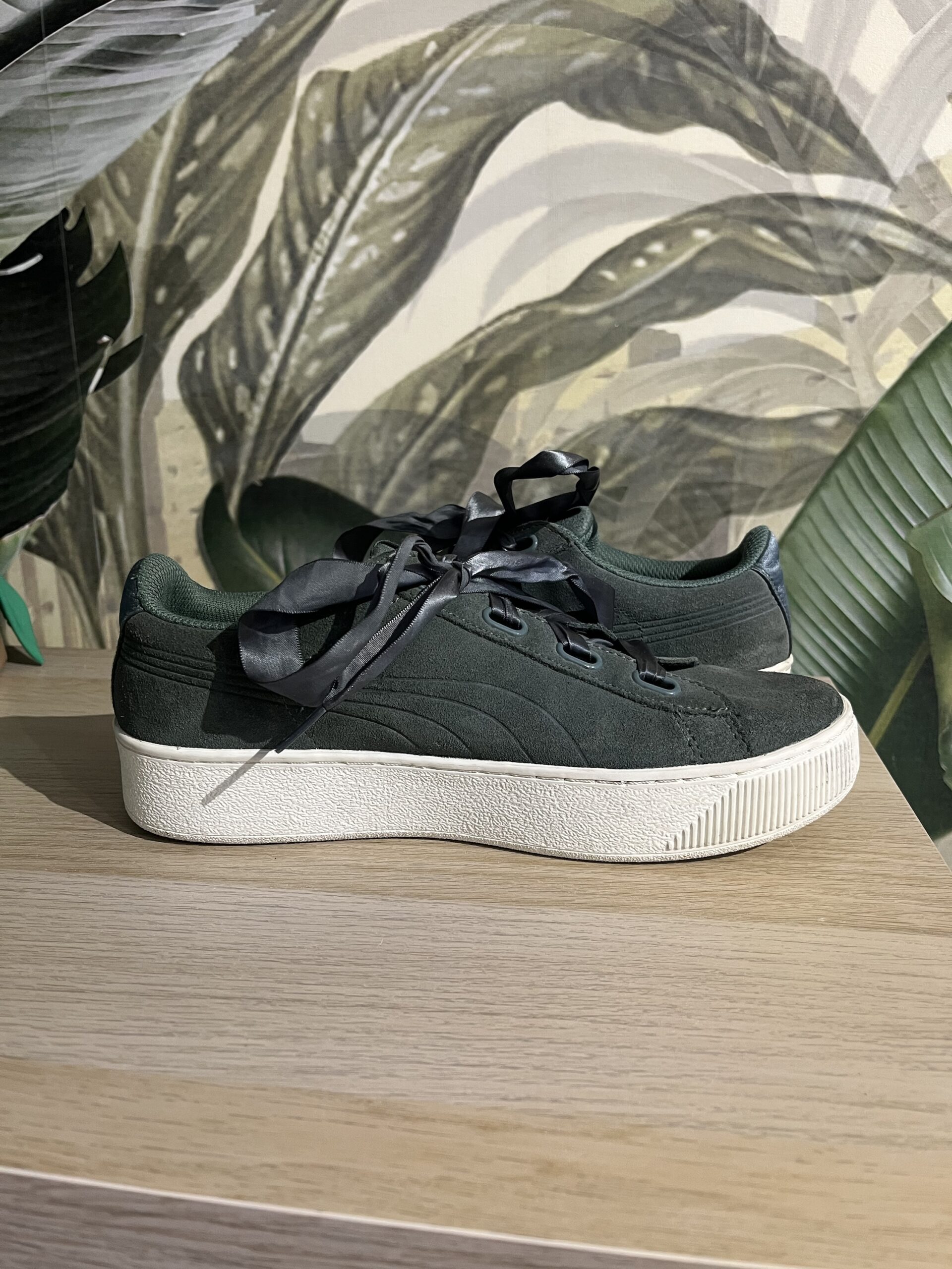 Sneakers Puma Vikky Platform Ribbon S, din piele, culoare verde oliv, sireturi de satin, brat moale din spuma, marime 40, interior 25-25,5 cm, purtati, stare excelenta