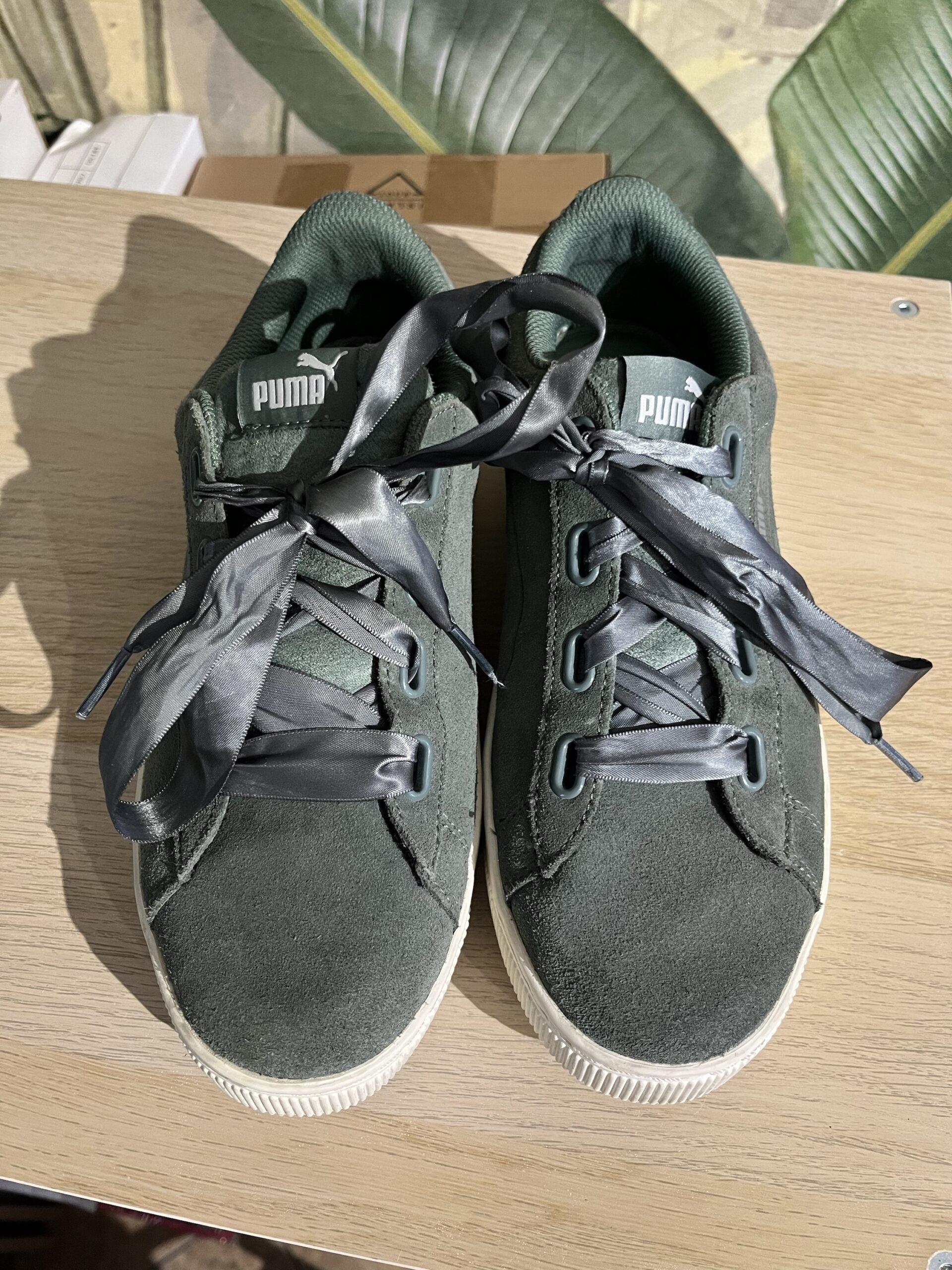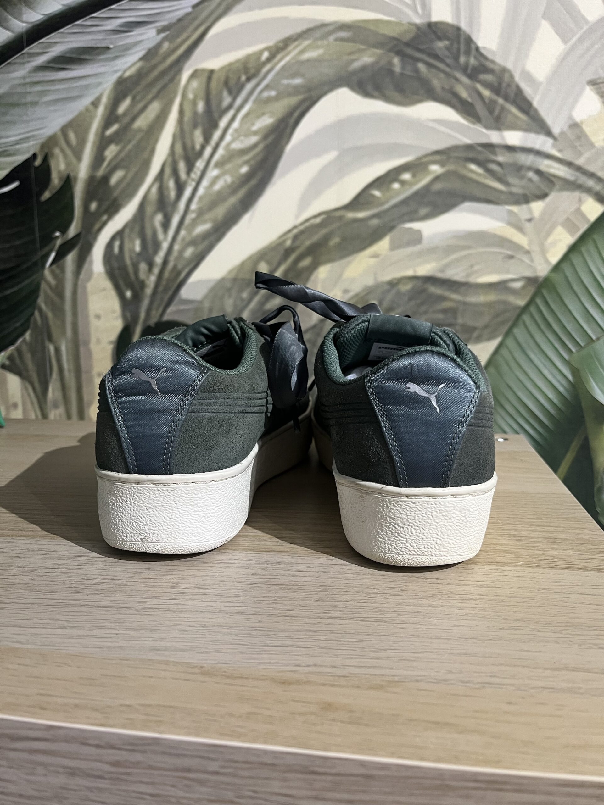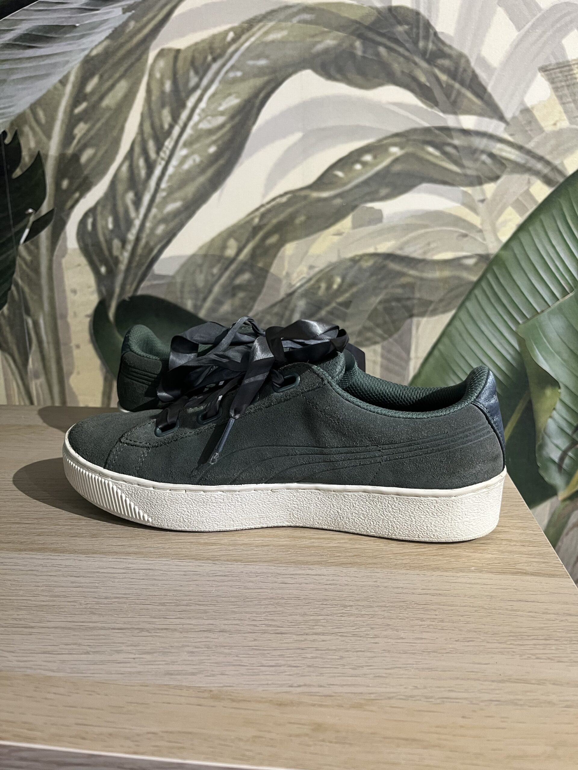 Sneakers Puma Vikky Platform Ribbon S, din piele, culoare verde oliv, sireturi de satin, brat moale din spuma, marime 40, interior 25-25,5 cm, purtati, stare excelenta