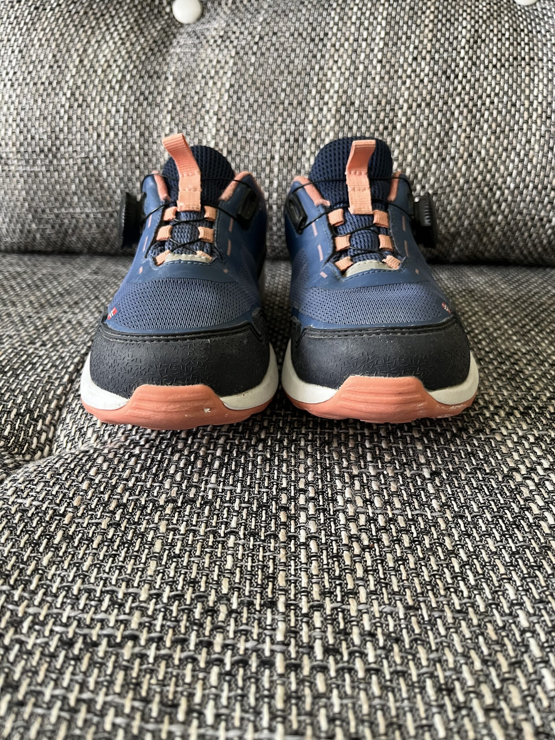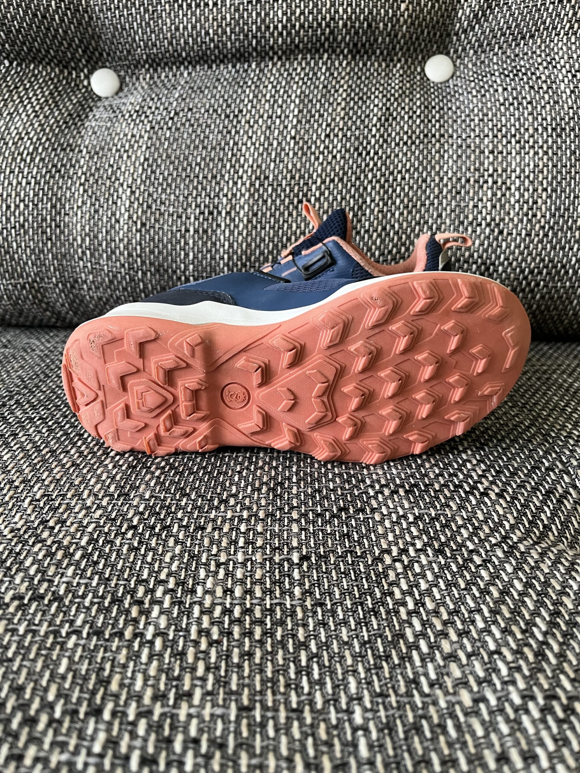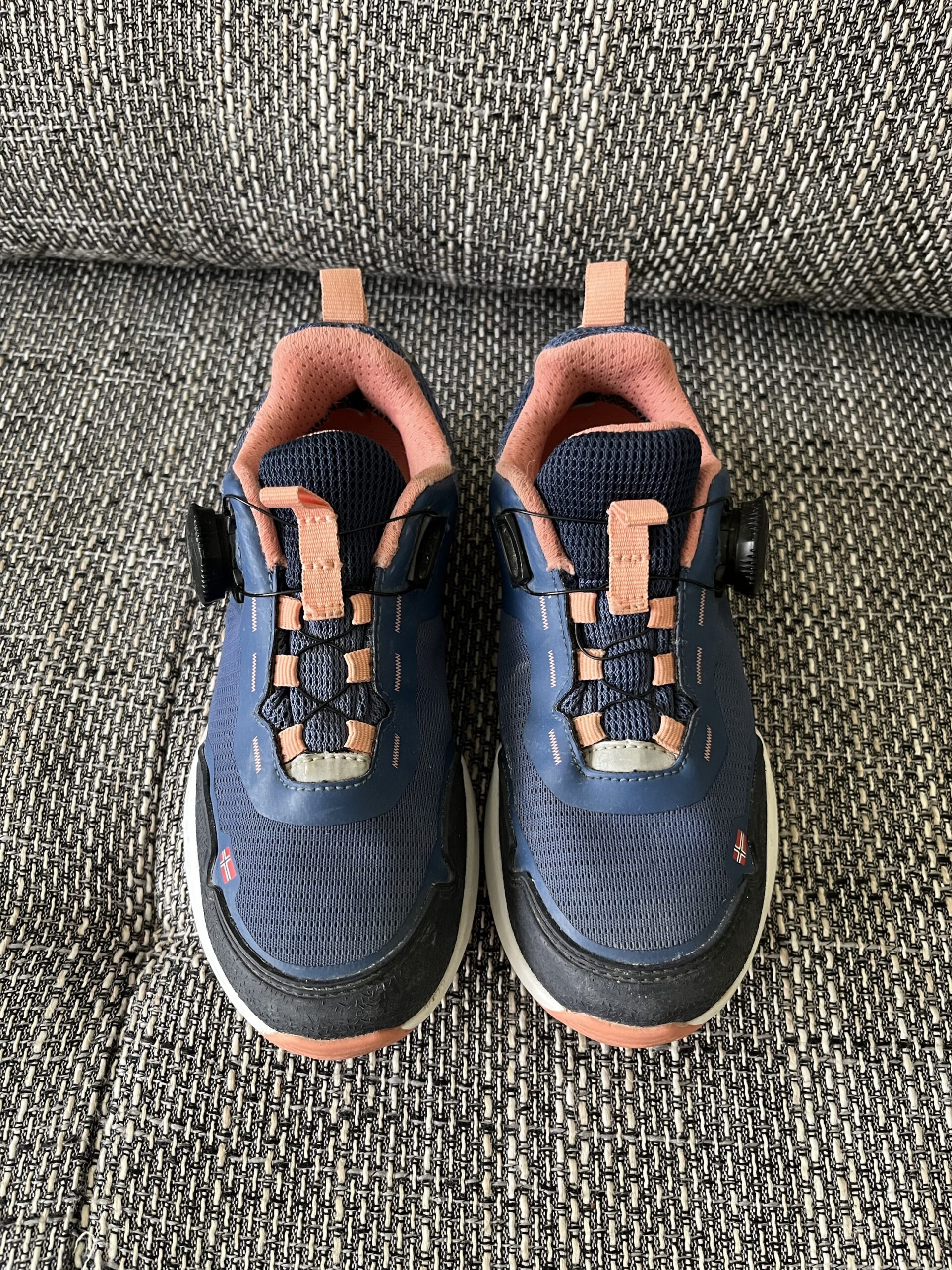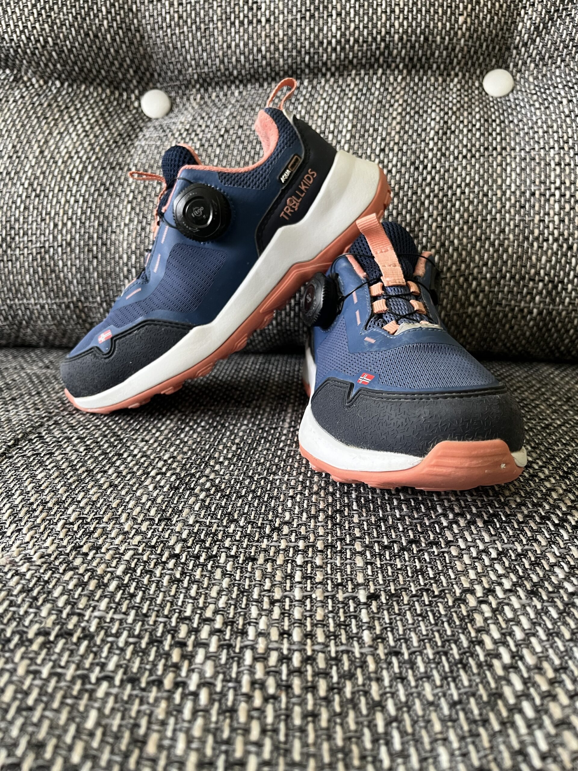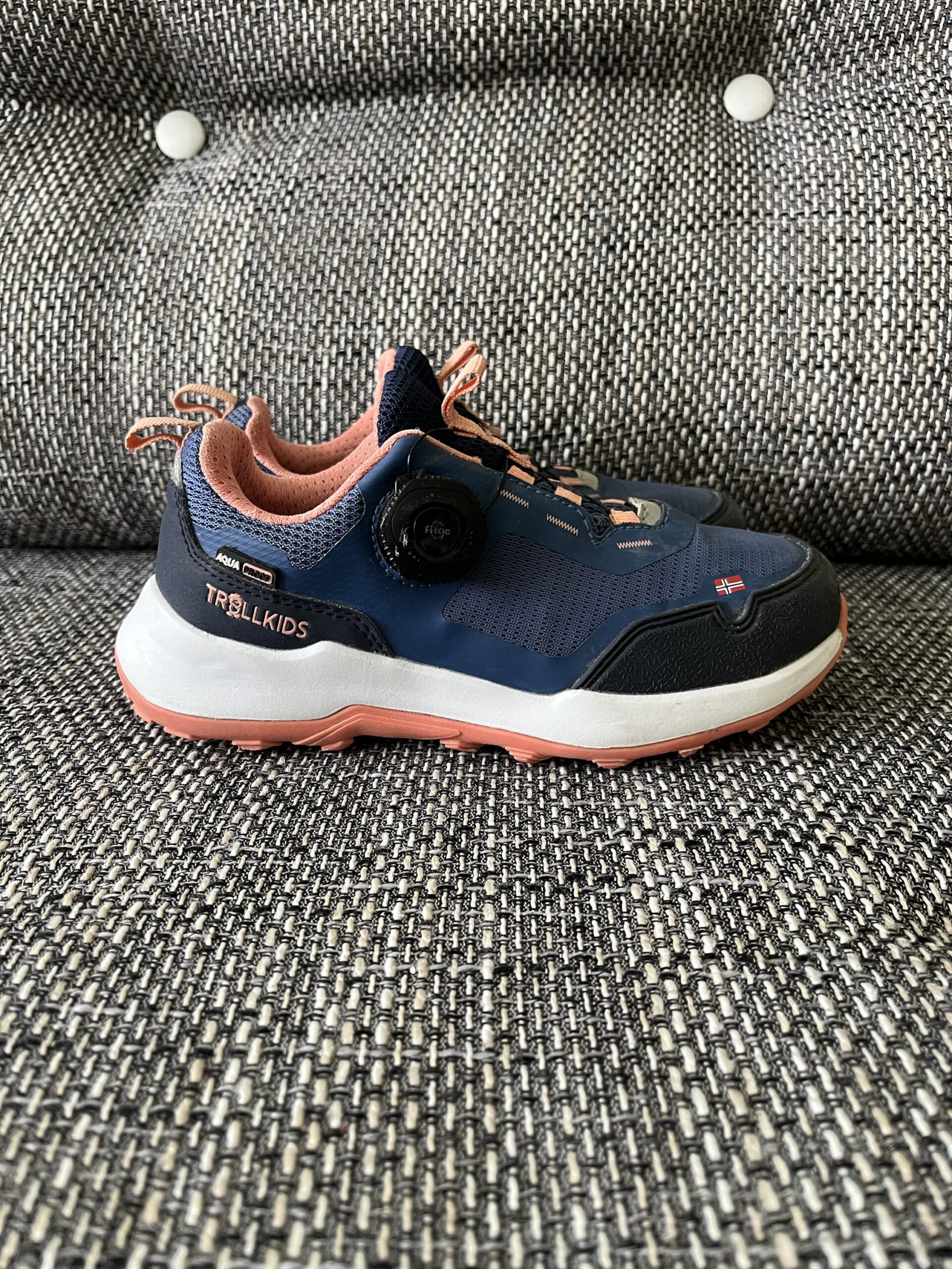 Sneakers Trollkids, culoare bleumarin / corai, material impermeabil AquaProof, cu sireturi rapide Fitgo, perfecti pentru hiking / trekking, marime 31, interior 19,5cm, purtati, stare execlenta