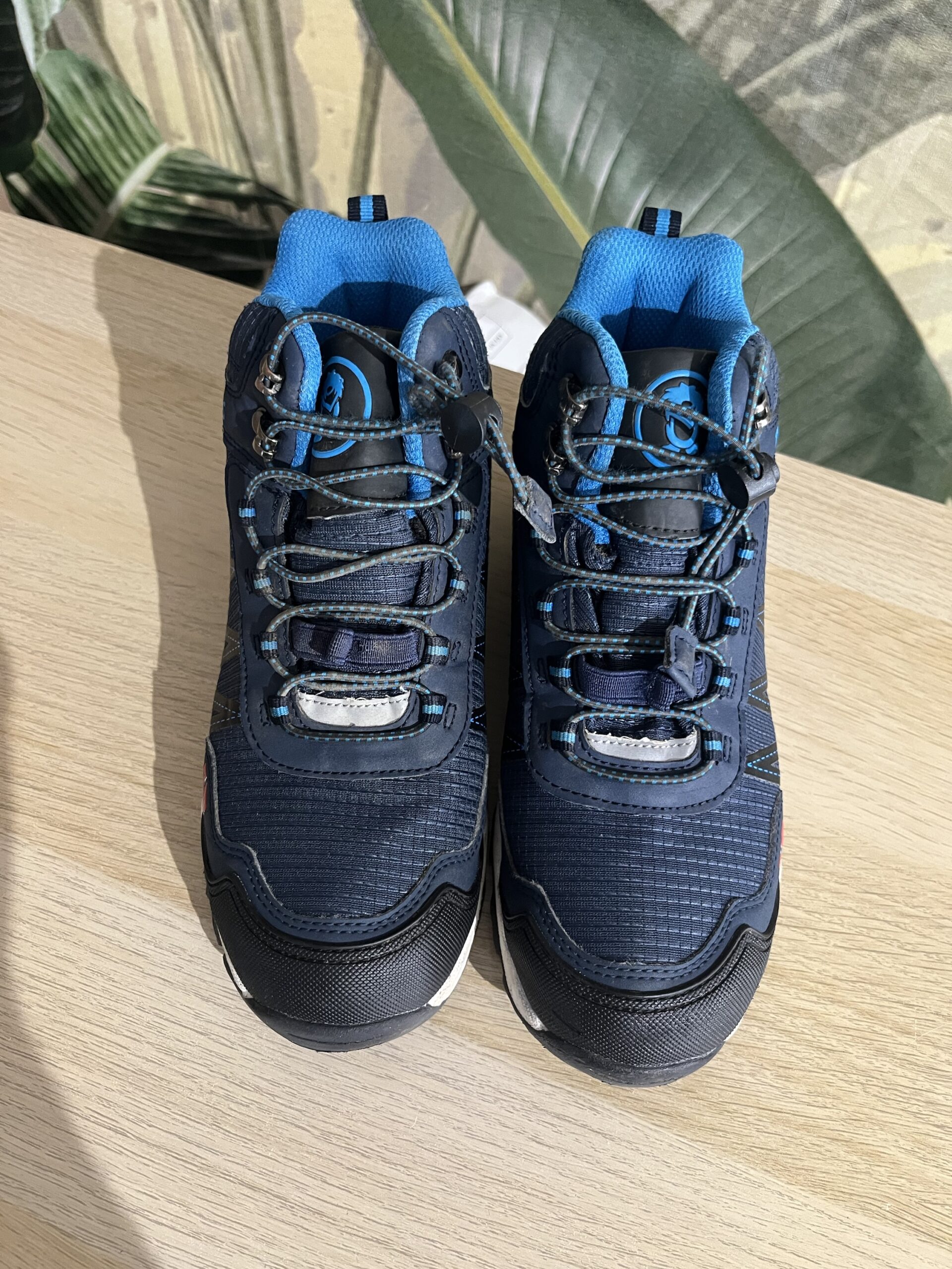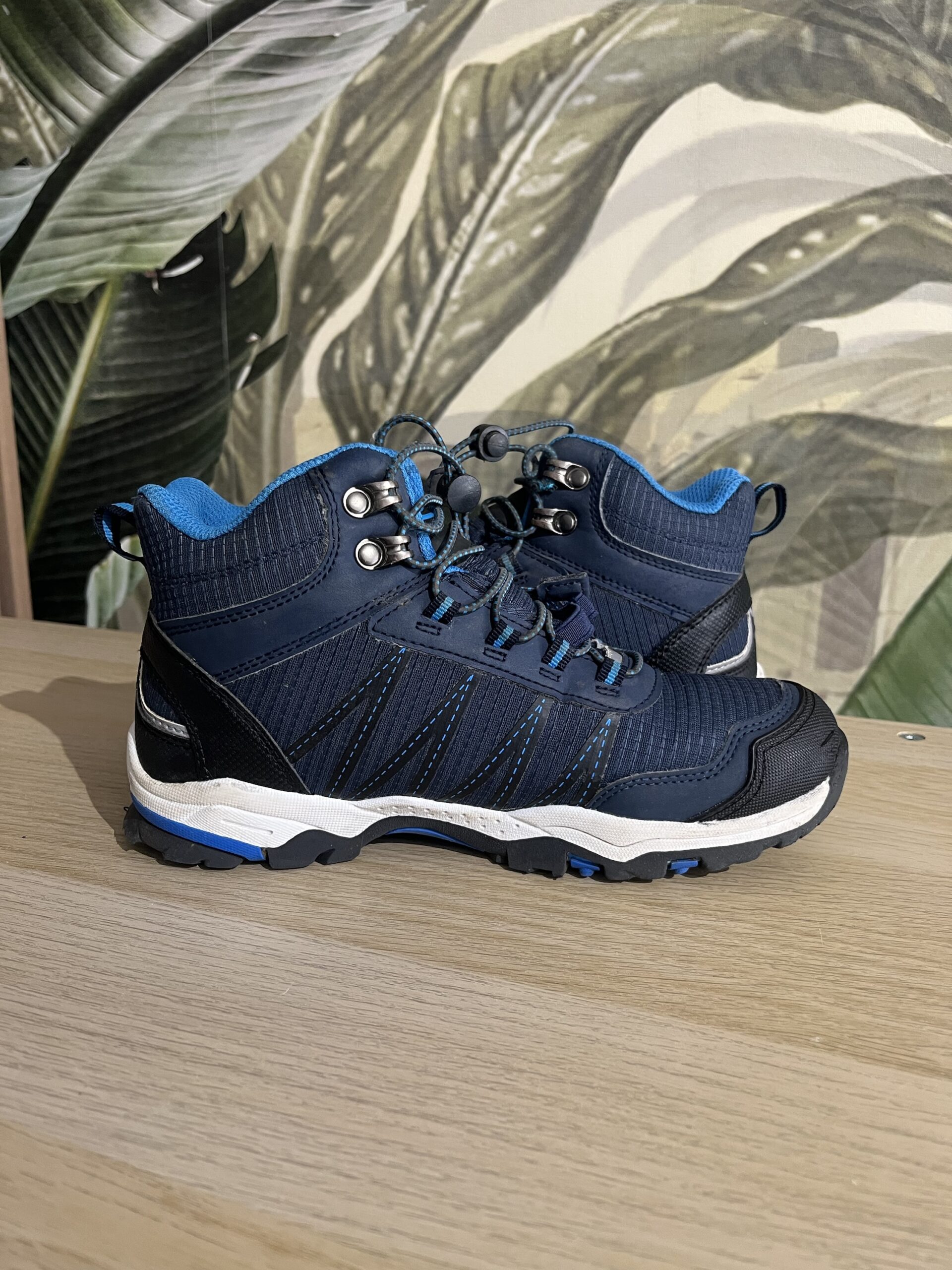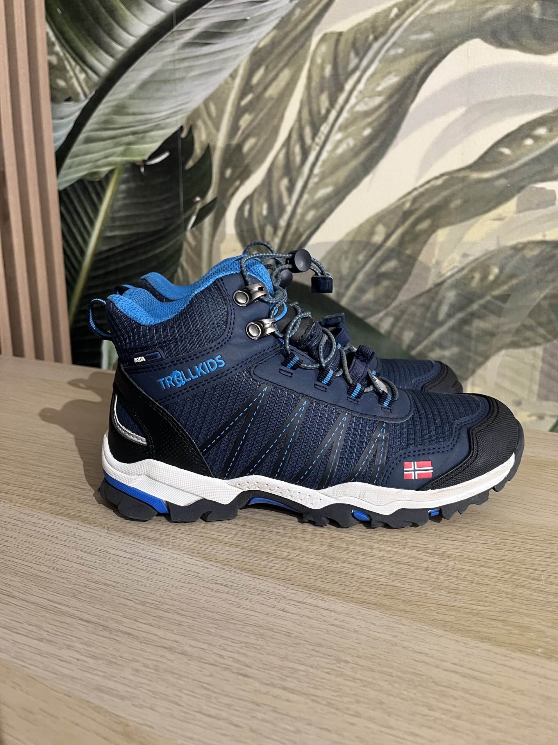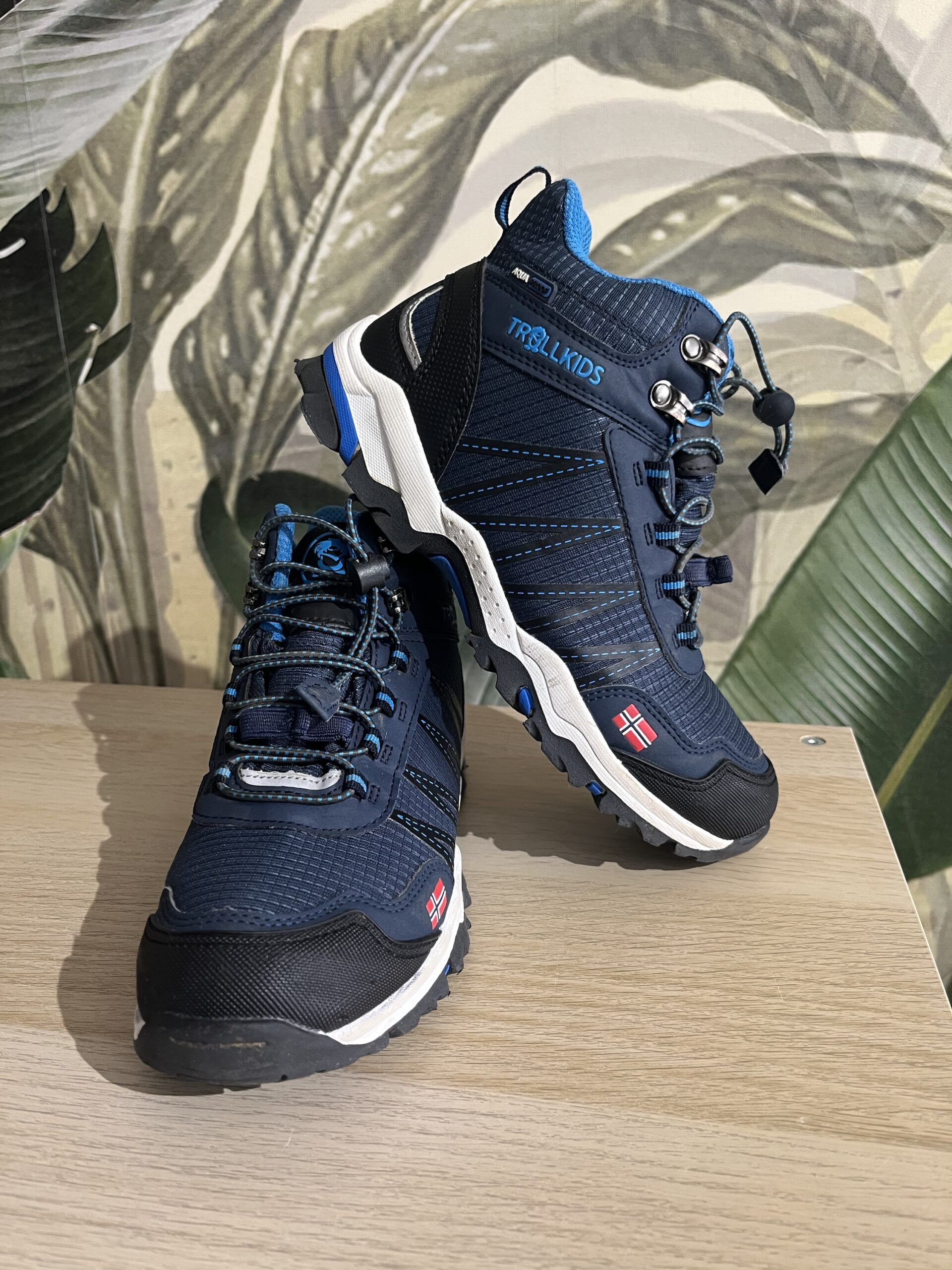 Sneakers Trollkids “Trolltunga Hiker Mid”, culoare bleumarin, inalti peste glezna, material impermeabil AquaProof, cu sireturi elastice, marime 35, interior 22,5 cm, perfecti pentru trekking / hiking, purtati, stare foarte buna